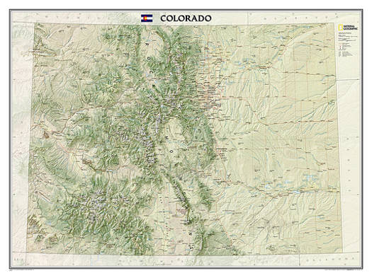 The spectacular topography of the Centennial State is expertly rendered on National Geographic's wall map of Colorado. Part of the growing series of State Wall Maps, this map depicts Colorado's diverse terrain and vegetation in remarkable detail. Mountain ranges, prominent peaks, major lakes, rivers, and reservoirs, and other geographic features are highlighted. In addition to hundreds of place names, this map includes the precise locations of cities, major roadways and railways, airports, military installations, federal and state parks, and protected areas. Prominent recreation features such as the Colorado Trail, Continental Divide Trail, and ski areas are also noted. This striking map would be an attractive addition to any study or office.