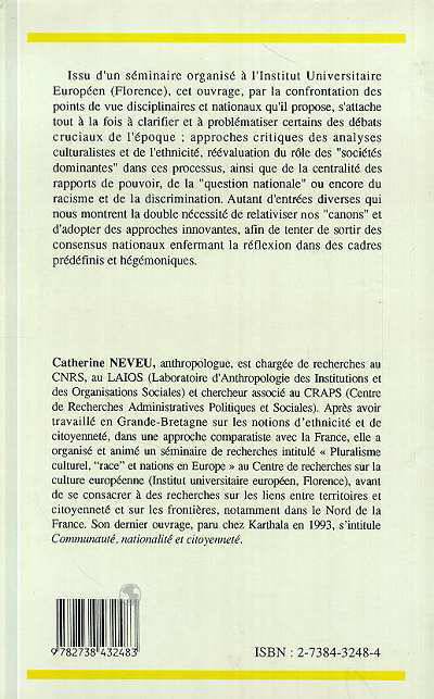 Issu d'un séminaire organisé à l'Institut universitaire européen (Florence). Les auteurs s'attachent à clarifier et à problématiser certains débats cruciaux de l'époque : approches critiques des analyses culturalistes et de l'ethnicité, réévaluation du rôle des "sociétés dominantes" dans ces processus, ainsi que de la centralité des rapports de pouvoir, de la "question nationale" ou du racisme.