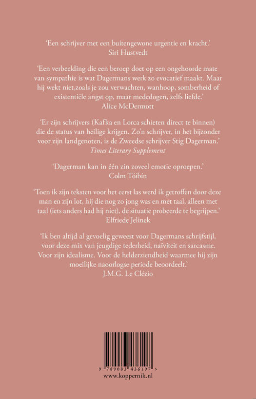 Stig Dagerman (1923-1954) debuteerde op tweeëntwintigjarige leeftijd met de roman De slang. Daarna publiceerde hij in vier jaar tijd de verhalenbundel Nachtspelletjes, het reisverslag Duitse herfst en de romans Het eiland der verdoemden, Het verbrande kind en Bruiloftslied. Dagerman geldt door zijn originaliteit en intensiteit als een van de allergrootste Zweedse schrijvers. Op eenendertigjarige leeftijd pleegde hij zelfmoord.