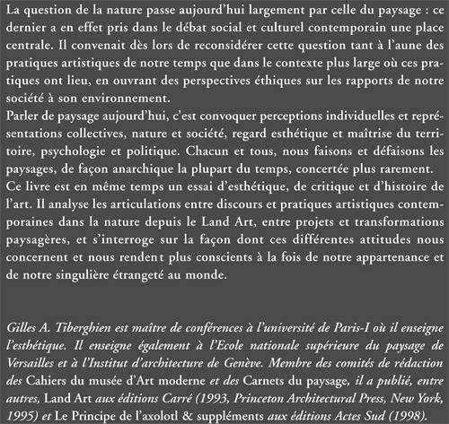 Ce livre est en même temps un essai d'esthétique, de critique et d'histoire de l'art. Il analyse les articulations entre discours et pratiques artistiques contemporaines dans la nature depuis le Land Art, entre projets et transformations paysagères, et s'interroge sur la façon dont ces différentes attitudes nous concernent et nous rendent plus conscients à la fois de notre appartenance et de notre singulière étrangeté au monde.