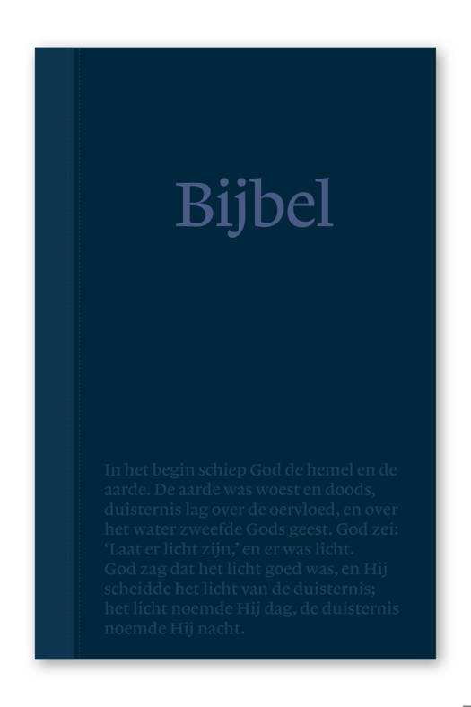 zijn ‘gepreegd’ in het materiaal. Dat betekent dat er reliëf ontstaat en dat de bijbeltekst op het omslag voelbaar