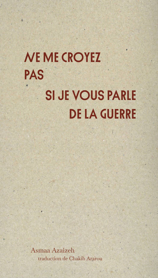 Asmaa Azaizeh est une poétesse, performeuse et curatrice palestinienne née en 1985 À Haïfa. Elle a dirigé le musée Mahmoud Darwich à Ramallah, son travail poétique est traduit en plusieurs langues. «Â Ne me croyez pas si je vous parle de la guerre » est son troisième recueil. À contre-courant d'un héritage poétique marqué par les figures masculines aux voix prophétiques, Asmaa Azaizeh écrit la guerre qu'elle n'a pas vécue et qu'elle vit pourtant. Résolument incarnée, si son écriture vient se placer du côté de la prophétie c'est comme vision, comme expérience totale qui peut aussi dire la violence faite au corps dans ses multiples dimensions, et le traduire dans un flot d'images denses et puissantes.