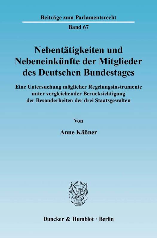Nebentätigkeiten und Nebeneinkünfte von Parlamentsabgeordneten bilden seit jeher Anlass für eine immer wieder aufflammende verfassungsrechtliche und verfassungspolitische Diskussion um das grundgesetzliche Abgeordnetenbild. Zentrale Verfassungsnorm ist dabei Art. 38 I 2 GG, der das Bild eines freien und nur seinem Gewissen unterworfenen Abgeordneten zeichnet. Hiermit treten wirtschaftliche Interessenverflechtungen in Konflikt. Anne Käßner greift diese Problematik auf, beleuchtet die Konfliktsituationen und untersucht mögliche Lösungsansätze. Vergleichend werden die für die anderen Staatsgewalten geltenden Regelungen im Hinblick auf Nebentätigkeiten und Nebeneinkünfte der Amtsträger herangezogen. Die Autorin erörtert und begründet notwendige Regelungsunterschiede und unberechtigte Divergenzen anhand der Funktionsgrundlagen der drei Staatsgewalten.