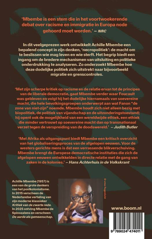 ‘Met zijn scherpe kritiek op racisme en de relatie ervan tot de principes van de liberale democratie, gaat Mbembe verder waar Foucault was gebleven en volgt hij het dodelijke hiernamaals van soevereine macht, die hele bevolkingsgroepen onderwerpt aan wat Fanon “de zone van niet-zijn” noemde. Mbembe houdt zich niet alleen bezig met biopolitiek, de politiek van vijandschap en de uitzonderingstoestand; hij opent ook de mogelijkheid van een wereldwijde ethiek, een ethiek die minder vertrouwt op soevereine macht dan op transnationaal verzet tegen de verspreiding van de doodswereld.’