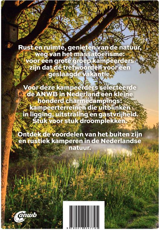 Rust en ruimte, genieten van de natuur, weg van het massatoerisme: voor een grote groep kampeerders zijn dat dé trefwoorden voor een geslaagde vakantie. Voor deze kampeerders selecteerde de ANWB in Nederland zesennegentig charmecampings: kampeerterreinen die uitblinken in ligging, uitstraling en gastvrijheid. Met ruime, groene standplaatsen op idyllische plekken, zoals in de bossen, in de buurt van het strand of aan een mooi meertje. Stuk voor stuk droomplekken. Vaak heeft een charmecamping iets weg van natuurkamperen. Meestal zijn voorzieningen als een zwembad, een restaurant of een campingwinkel niet of beperkt aanwezig op de camping zelf en ook animatie wordt op de meeste campings niet of beperkt aangeboden. Een charmecamping is niet te groot en niet te klein: het aantal standplaatsen ligt tussen de twintig en tweehonderd. Zo heb je nergens het gevoel een nummer te zijn. Je kunt rekenen op wat meer persoonlijke aandacht van de campingbeheerder, want gastvrijheid staat bij deze campings hoog in het vaandel. Een ander kenmerk van charmecampings is dat ze qua locatie uitblinken: een fraai uitzicht, mooie natuurlijke begroeiing of historische gebouwen in de directe omgeving. Soms is een deel van de camping natuurkampeerterrein. Dat is vaak een van de redenen om deze camping als charmecamping te kwalificeren. Zoals ook voor andere campings geldt, is het gedurende het hoogseizoen of tijdens speciale evenementen op charmecampings iets drukker. We hopen met deze uitgave te helpen in de zoektocht naar dat éne uitgelezen plekje. Hopelijk kom je dan net zo enthousiast terug van vakantie als de onze campinginspecteurs.