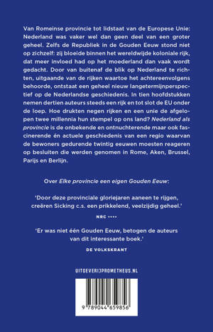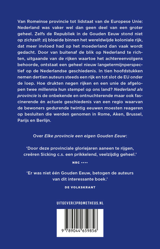 Van Romeinse provincie tot lidstaat van de Europese Unie: Nederland was vaker wel dan geen deel van een groter geheel. Zelfs de Republiek in de Gouden Eeuw stond niet op zichzelf: zij bloeide binnen het wereldwijde koloniale rijk, dat meer invloed had op het moederland dan vaak wordt gedacht. Door van buitenaf de blik op Nederland te richten, uitgaande van de rijken waartoe het achtereenvolgens behoorde, ontstaat een geheel nieuw langetermijnperspectief op de Nederlandse geschiedenis. In tien hoofdstukken nemen dertien auteurs steeds een rijk en tot slot de EU onder de loep. Hoe drukten negen rijken en een unie de afgelopen twee millennia hun stempel op ons land? Nederland als provincie is de onbekende en ontnuchterende maar ook fascinerende én actuele geschiedenis van een regio waarvan de bewoners gedurende twintig eeuwen moesten reageren op besluiten die werden genomen in Rome, Aken, Brussel, Parijs en Berlijn.