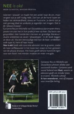 Iedereen 'pleaset': je maakt het een ander naar de zin, maar vergeet wat je zelf nodig hebt. Dat kan uit de hand lopen en leiden tot vermoeidheid, stress en frustratie. Je denkt dat je niet genoeg doet en anderen je eigenlijk niet mogen. Dat is de 'please disease'. Carianne Ros en Michelle van Dusseldorp zijn ervaren therapeuten en zien het in hun praktijk keer op keer. Op basis van gesprekken met honderden mensen en grondige literatuurstudie ontdekten ze zeven 'pleasetypes'. In dit boek leggen ze deze uit. Via een eenvoudige test kan de lezer ontdekken welk type bij hem of haar hoort. Nee is oké biedt vele concrete adviezen om te groeien, zodat de lezer zelfbewuster in het leven kan staan en kan genezen van de please disease. Het boek geeft talrijke handreikingen voor een leven met minder moeten en meer vreugde.