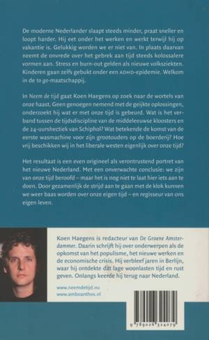 In Neem de tijd gaat Koen Haegens op zoek naar de wortels van onze haast. Geen genoegen nemend met de geijkte oplossingen, onderzoekt hij wat er met onze tijd is gebeurd.