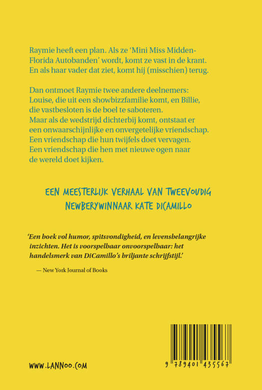 Ontroerend verhaal over vriendschap Raymie heeft een plan. Als ze 'Mini Miss Midden-Florida Autobanden' wordt, komt ze vast in de krant. En als haar vader dat ziet, komt hij (misschien) terug. Dan ontmoet Raymie twee andere deelnemers: Louise, die uit een showbizzfamilie komt, en Billie, die vastbesloten is de boel te saboteren. Maar als de wedstrijd dichterbij komt, ontstaat er een onwaarschijnlijke en onvergetelijke vriendschap. Een vriendschap die hun twijfels doet vervagen. Een vriendschap die hen met nieuwe ogen naar de wereld doet kijken.