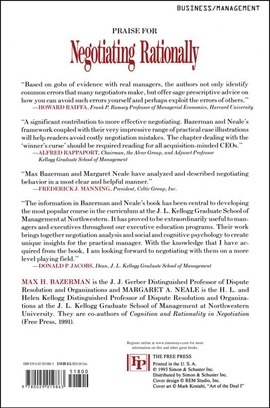 In Negotiating Rationally, Max Bazerman and Margaret Neale explain how to avoid the pitfalls of irrationality and gain the upper hand in negotiations. For example, managers tend to be overconfident, to recklessly escalate previous commitments, and fail to consider the tactics of the other party. Drawing on their research, the authors show how we are prisoners of our own assumptions. They identify strategies to avoid these pitfalls in negotiating by concentrating on opponents' behavior and developing the ability to recognize individual limitations and biases. They explain how to think rationally about the choice of reaching an agreement versus reaching an impasse. A must read for business professionals.
