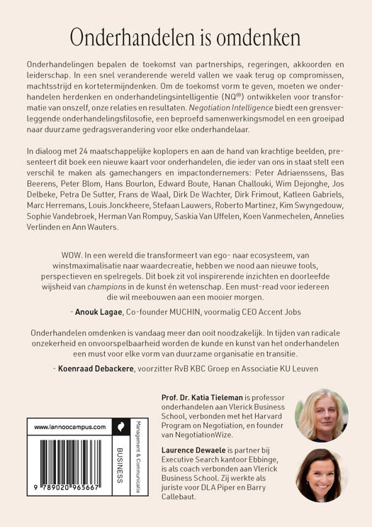 Wat zou er gebeuren als we erin zouden slagen om anders te onderhandelen? Onderhandelingen maken of breken partnerships, regeringen, akkoorden, huwelijken en leiders. Meer dan ooit, zijn wij zijn allemaal onderhandelaars in een voortdurend onderhandelende wereld. Om de onderhandelingsuitdagingen van de 21e eeuw het hoofd te bieden, hebben we een paradigmawissel nodig. In dit boek wordt onderhandelen omgedacht als een krachtig middel voor persoonlijke en maatschappelijke transformatie. In het kielzog van IQ en EQ maakt NQ® (Negotiation Intelligence) het verschil. In plaats van de traditionele tips, tricks en technieken, biedt het NQ®paradigma een impactvol en beproefd samenwerkingsmodel dat de nadruk legt op echte gedragsverandering en waardecreatie. Waarom?
