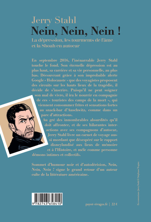 En septembre 2016, l'inénarrable Jerry Stahl touche le fond. La dépression qui le ronge depuis toujours est au plus haut, sa carrière et sa vie personnelle au plus bas. Lorsqu'il découvre au détour d'une improbable alerte Google « Holocauste » que des tours opérateurs organisent des voyages en car à travers l'Allemagne et la Pologne sur les lieux de la tragédie, il décide de s'inscrire. S'il ne peut soigner sa dépression, il ira la nourrir en compagnie de ces étranges « touristes des camps de la mort ». Roadtrip collectif dément, entre introspection récalcitrante et expérience post-gonzo, « Nein, Nein, Nein ! » se présente comme une enquête corrosive et hilarante sur le rapport disneylandisé aux lieux de mémoire, où Jerry déploie toutes les nuances de son humour tordu absolument unique.