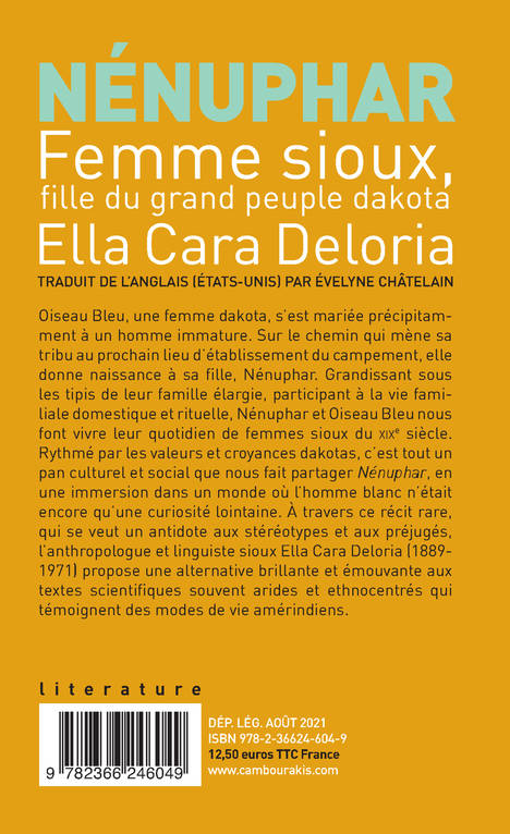 Oiseau Bleu, une femme dakota, s'est mariée précipitamment à un homme immature. Sur le chemin qui mène sa tribu au prochain lieu d'établissement du campement, elle donne naissance à sa fille, Nénuphar. Grandissant sous les tipis de leur famille élargie, participant à la vie familiale domestique et rituelle, Nénuphar et Oiseau Bleu nous font vivre leur quotidien de femmes sioux du xixe siècle. Rythmé par les valeurs et croyances dakotas, c'est tout un pan culturel et social que nous fait partager Nénuphar, en une immersion dans un monde où l'homme blanc n'était encore qu'une curiosité lointaine. À travers ce récit rare, qui se veut un antidote aux stéréotypes et aux préjugés, l'anthropologue et linguiste sioux Ella Cara Deloria (1889-1971) propose une alternative brillante et émouvante aux textes scientifiques souvent arides et ethnocentrés qui témoignent des modes de vie amérindiens.