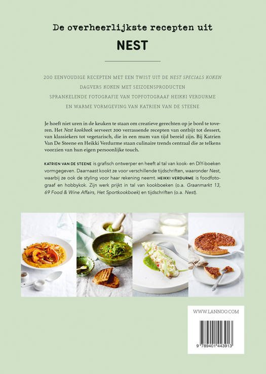 Je hoeft niet uren in de keuken te staan om creatieve gerechten op je bord te toveren. Het Nest kookboek serveert 200 verrassende recepten van ontbijt tot dessert, van klassiekers tot vegetarisch, die in een mum van tijd bereid zijn. Bij Katrien Van De Steene en Heikki Verdurme staan culinaire trends centraal die ze telkens voorzien van hun eigen persoonlijke twist.