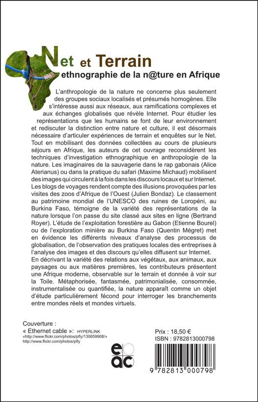L’anthropologie de la nature ne concerne plus seulement des groupes sociaux localisés et présumés homogènes. Elle s’intéresse aussi aux réseaux, aux ramifications complexes et aux échanges globalisés que révèle Internet. Pour étudier les représentations que les humains se font de leur environnement et rediscuter la distinction entre nature et culture, il est désormais nécessaire d’articuler expériences de terrain et enquêtes sur le Net. Tout en mobilisant des données collectées au cours de plusieurs séjours en Afrique, les auteurs de cet ouvrage reconsidèrent les techniques d’investigation ethnographique en anthropologie de la nature.§ §Les imaginaires de la sauvagerie dans le rap gabonais (Alice Aterianus) ou dans la pratique du safari (Maxime Michaud) mobilisent des images qui circulent à la fois dans les discours locaux et sur Internet. Les blogs de voyages rendent compte des illusions provoquées par les visites des zoos d’Afrique de l’Ouest (Julien Bondaz). Le classement au patrimoine mondial de l’UNESCO des ruines de Loropéni, au Burkina Faso, témoigne de la variété des représentations de la nature lorsque l’on passe du site classé aux sites en ligne (Bertrand Royer). L’étude de l’exploitation forestière au Gabon (Etienne Bourel) ou de l’exploration minière au Burkina Faso (Quentin Mégret) met en évidence les différents niveaux d’analyse des processus de globalisation, de l’observation des pratiques locales des entreprises à l’analyse des images et des discours qu’elles diffusent sur Internet.§ §En décrivant la variété des relations aux végétaux, aux animaux, aux paysages ou aux matières premières, les contributeurs présentent une Afrique moderne, observable sur le terrain et donnée à voir sur la Toile. Métaphorisée, fantasmée, patrimonialisée, consommée, instrumentalisée ou quantifiée, la nature apparaît comme un objet d’étude particulièrement fécond pour interroger les branchements entre mondes réels et mondes virtuels.