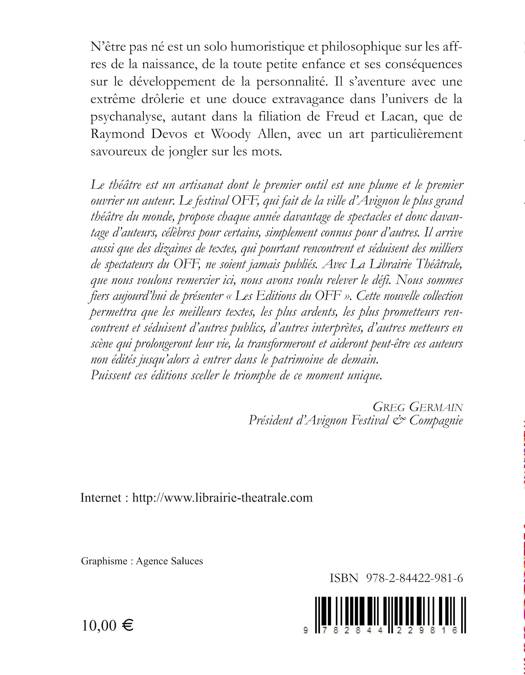 N'être pas né est un solo humoristique et philosophique sur les affres de la naissance, de la toute petite enfance et ses conséquences sur le développement de la personnalité. Il s'aventure avec une extrême drôlerie et une douce extravagance dans l'univers de la psychanalyse, autant dans la filiation de Freud et Lacan, que de Raymond Devos et Woody Allen, avec un art particulièrement savoureux de jongler sur les mots.