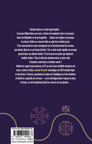 Extraterrestres au crâne hypertrophié… Cerveaux flottant dans une cuve, à même de manipuler rêves et souvenirs, doués de télépathie ou de précognition… Depuis ses origines ou presque, la science-fiction se creuse la tête au sujet de la matière grise. Si les neurosciences nous renseignent sur le fonctionnement du cerveau, que disent-elles de ce qu’il pourrait faire ? De ce dont serait capable un cerveau poussé dans ses ultimes limites ? Et où trouver les pistes qui explorent lesdites limites ? Dans la tête des extraterrestres ou dans celle d’humains vivant dans un lointain avenir ? Mettant en regard neurosciences et SF au sein d’une véritable entreprise de neuro-science-fiction, Laurent Vercueil, neurologue au CHU Grenoble Alpes et chercheur à l’Inserm, questionne la nature de l’intelligence et des émotions, et étudie les capacités du cerveau — qu’il soit éloigné dans l’espace ou dans le temps, ou tout simplement juché au-dessus de nos épaules…