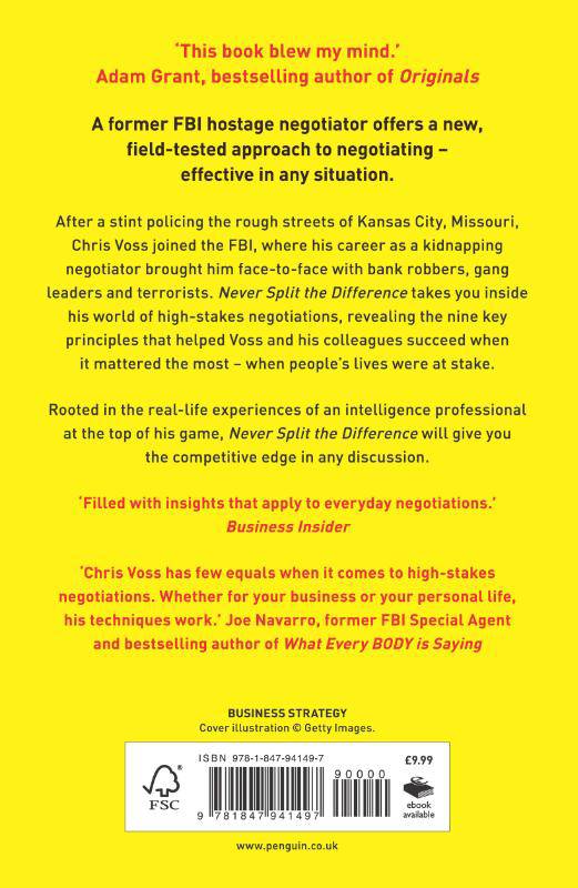A former FBI hostage negotiator offers a new, field-tested approach to negotiating - effective in any situation. After a stint policing the rough streets of Kansas City, Missouri, Chris Voss joined the FBI, where his career as a kidnapping negotiator brought him face-to-face with bank robbers, gang leaders and terrorists.