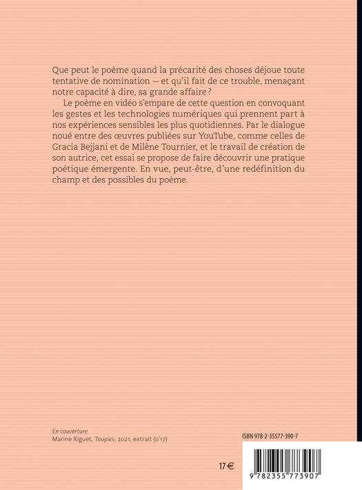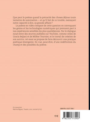 Un hiatus entre les altérations du réel et nos manières de le dire réclame une parole capable de rendre à la vue ce qui nous environne.Que peut le poème quand la précarité des choses déjoue toute tentative de nomination — et qu’il fait de ce trouble, menaçant notre capacité à dire, sa grande affaire ?Le poème en vidéo s’empare de cette question en convoquant les gestes et les technologies numériques qui prennent part à nos expériences sensibles les plus quotidiennes. Par le dialogue noué entre des œuvres publiées sur YouTube, comme celles de Gracia Bejjani et de Milène Tournier, et le travail de création de son autrice, cet essai se propose de faire découvrir une pratique poétique émergente. En vue, peut-être, d’une redéfinition du champ et des possibles du poème.