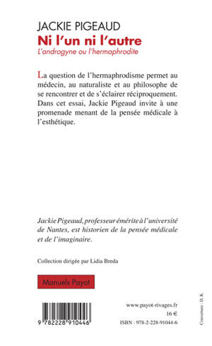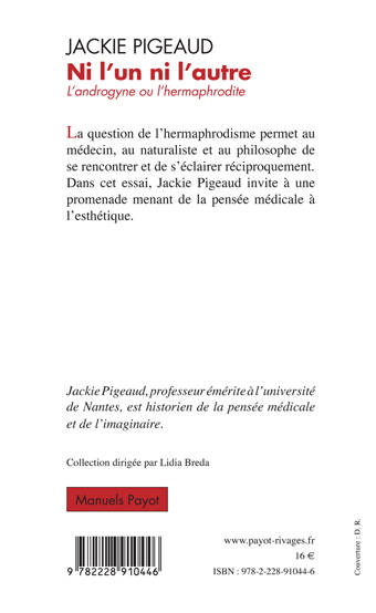 Religieuse ? sexuelle ? Esthétique ? La question de l'hermaphrodisme permet au médecin, au naturaliste et au philosophe de se rencontrer et de s'éclairer réciproquement. Dans cet essai, Jackie Pigeaud invite à une promenade menant de la pensée médicale à l'esthétique.