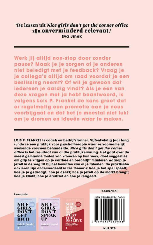 Lois P. Frankel is coach en bedrijfstrainer. Vijfentwintig jaar lang runde ze een praktijk voor psychotherapie waar ze voornamelijk werkende vrouwen behandelde. Nice girls don’t get the corner office is het resultaat van al die praktijkervaring. Het gaat over de meest gemaakte fouten van vrouwen op hun werk, het doet suggesties om grip te krijgen op je carrière en het beschrijft manieren waarop je jezelf in de weg zit bij het benutten van al je talenten. De praktische adviezen zijn onderverdeeld in zes thema's: hoe je het spel speelt; hoe je je gedraagt; hoe je denkt; hoe je jezelf op de markt brengt; hoe je klinkt; hoe je eruitziet en hoe je reageert.