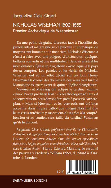 En une petite vingtaine d’années face à l’hostilité des protestants et malgré une santé précaire et un manque de moyens tant humains que financiers, Nicholas Wiseman a réussi à faire avec une poignée d’aristocrates, quelques brillants convertis et une multitude d’Irlandais misérables une véritable « Eglise en Angleterre » avec laquelle le pays devra compter. Les paroles et les écrits de Nicholas Wiseman ont eu un effet décisif sur un John Henry Newman à la croisée des chemins et c’est aussi vers lui que Manning se tournera avant de quitter l’Église d’Angleterre. Newman et Manning ont éclipsé le cardinal comme celui-ci l’avait prédit en 1841 : « Si les théologiens d’Oxford se convertissent, nous devons être prêts à passer à l’arrière-plan. » mais si Newman et les convertis ont été bien accueillis dans l’Église catholique malgré l’hostilité que leurs écrits antérieurs y suscitaient, c’est grâce à la compréhension et au soutien sans faille du cardinal Wiseman qu’ils le doivent.