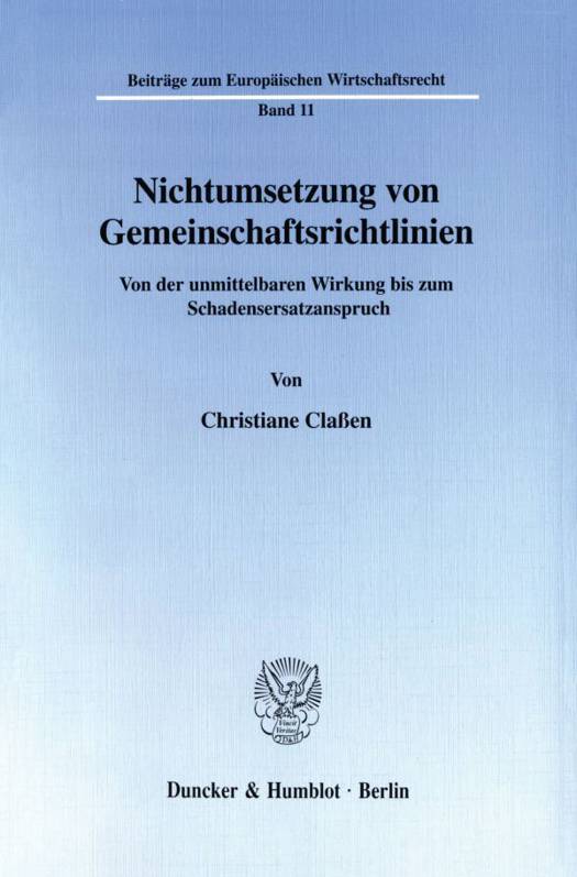 Die Autorin befaßt sich in der vorliegenden Veröffentlichung mit den Problemen der Nichtumsetzung von Gemeinschaftsrichtlinien. Besonderes Augenmerk wurde dabei auf eine möglichst umfassende Würdigung der Rechtsprechung und der teilweise kontroversen Literaturauffassungen zu diesem immer noch umstrittenen Thema gelegt.Im ersten Abschnitt stellt Christiane Claßen die Wesenszüge der Richtlinie dar. Sodann werden die einzelnen Folgen der Nichtumsetzung von Richtlinien aufgezeigt. Dabei wird zunächst auf das Entstehen der unmittelbaren Wirkung von Richtlinien eingegangen und anschließend der vom Europäischen Gerichtshof entwickelte Schadensersatzanspruch des einzelnen gegen den säumigen Mitgliedstaat untersucht.Die Autorin unterbreitet einen dogmatisch fundierten Lösungsvorschlag für die Begründung des bereits vom Europäischen Gerichtshof anerkannten Schadensersatzanspruchs bei Nichtumsetzung von Richtlinien.Als Ergebnis der Untersuchung ist der Anspruch auf Schadensersatz nicht lediglich aus der Gemeinschaftsrechtsordnung abzuleiten, sondern läßt sich in gleichem Maße auf die im Grundgesetz verankerten Grundsätze der freiheitlich-demokratischen Grundordnung zurückführen.