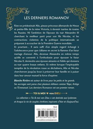 Derniers empereurs de Russie, Nicolas et Alix Romanov ont construit leur couple sur une foi profonde partagée. Confrontés à l'effondrement de leur empire, c'est dans leur amour du Christ, leur vie de couple et de famille qu'ils trouveront la force de traverser les épreuves et d'affronter la mort. "Toi + moi vers Dieu", nouvelle collection pour les lycéennes et jeunes adultes, sur la vie de couples chrétiens d’hier et d’aujourd’hui. Chacun à leur manière, ils ont vécu un amour brûlant, dans les joies comme dans les épreuves. La foi a été le socle de leur vie conjugale et le véritable secret de leur amour.