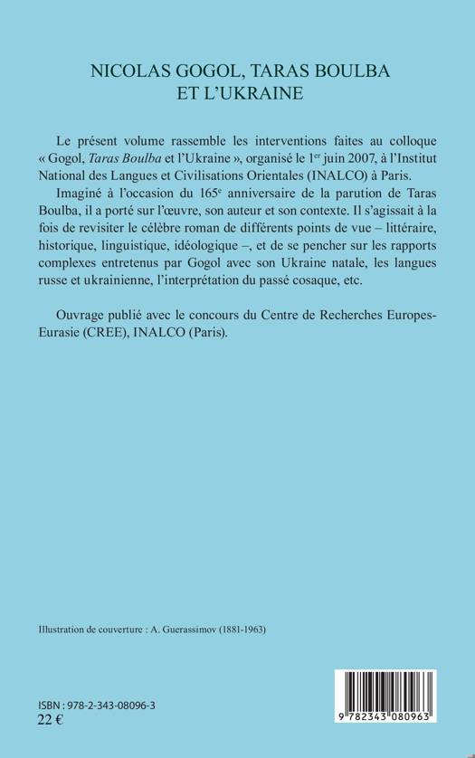 Ce livre rassemble les interventions faites au colloque « Gogol, Taras Boulba et l’Ukraine », organisé à l’INALCO à Paris. Imaginé à l’occasion du 165e anniversaire de la parution de Taras Boulba, il a porté sur l’œuvre, son auteur et son contexte, revisitant le célèbre roman sous différents points de vue (littéraire, historique, linguistique, idéologique) et se penchant sur les rapports complexes entretenus par Gogol avec son Ukraine natale.