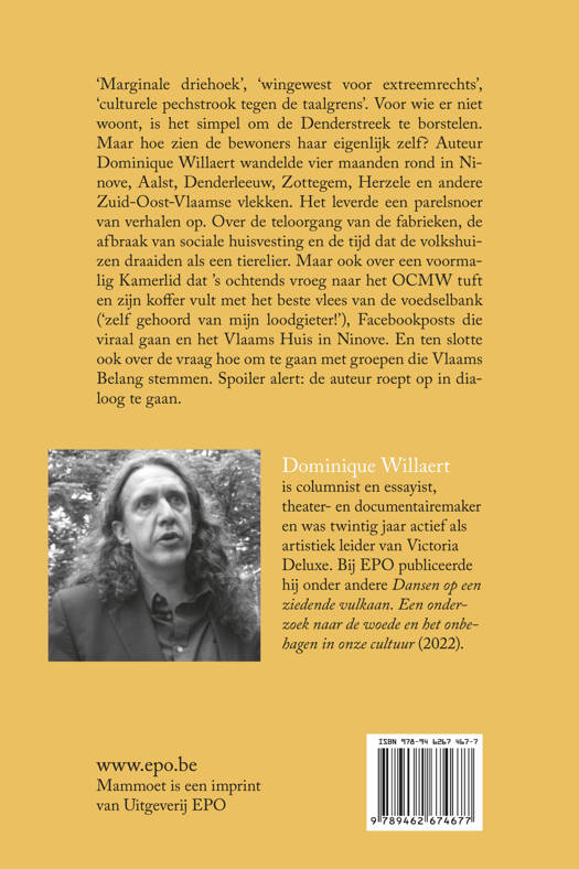 ‘Marginale driehoek’, ‘wingewest voor extreemrechts’, ‘culturele pechstrook tegen de taalgrens’. Voor wie er niet woont, is het simpel om de Denderstreek te borstelen. Maar hoe zien de bewoners haar eigenlijk zelf? Auteur Dominique Willaert wandelde vier maanden rond in Ninove, Aalst, Denderleeuw, Zottegem, Herzele en andere Zuid-Oost-Vlaamse vlekken. Het leverde een parelsnoer van verhalen op. Over de teloorgang van de fabrieken, de afbraak van sociale huisvesting en de tijd dat de volkshuizen draaiden als een tierelier. Maar ook over een voormalig Kamerlid dat ’s ochtends vroeg naar het OCWM tuft en zijn koffer vult met het beste vlees van de voedselbank (‘zelf gehoord van mijn loodgieter!’), Facebookposts die viraal gaan en het Vlaams Huis in Ninove. En ten slotte ook over de vraag hoe om te gaan met groepen die Vlaams Belang stemmen. Spoiler alert: de auteur roept op in dialoog te gaan.