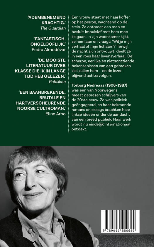 Een vrouw staat met haar koffer op het perron, wachtend op de trein. Ze ontmoet een man en besluit impulsief met hem mee te gaan. In zijn woonkamer kijkt ze hem aan en vraagt: ‘Wil je mijn verhaal of mijn lichaam?’ Terwijl de nacht zich ontvouwt, deelt ze in een roes haar levensverhaal. De scherpe, eerlijke en nietsontziende bekentenissen van een gebroken ziel zullen hem – en de lezer – blijvend achtervolgen.