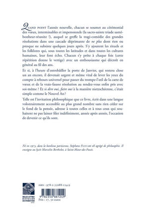Quand point l’année nouvelle, chacun se soumet au cérémonial des voeux, interminables et impersonnels (la sacro-sainte triade santé-bonheur-réussite !), auquel se greffe la tragi-comédie des grandes résolutions dans une cascade déprimante de ne plus dont rien ou presque ne subsiste quelques jours après. S’y ajoutent les rituels et les folklores qui, sous toutes les latitudes et dans toutes les cultures humaines, leur font écho. Chacun s’y prête à chaque fois (cette répétition donne le vertige) avec un enthousiasme qui décroît en général au fil des ans. Et si, à l’heure d’entrebâiller la porte de Janvier, qui restera close un an encore, il devenait urgent et même vital de lever les yeux du compte à rebours universel pour passer du trompe-l’oeil de la carte de voeux et de la vraie-fausse résolution au rendez-vous enfin pris avec soi-même ? Et si dire oui, faire oui à la manière nietzschéenne, c’était simple comme le Nouvel An ? Telle est l’invitation philosophique que ce livre, écrit dans une langue volontairement accessible au plus grand nombre sans rien céder sur le fond de la pensée, adresse à toutes celles et à tous ceux qui souhaitent ne pas laisser filer indéfiniment, année après année, l’occasion de devenir ce qu’ils sont.