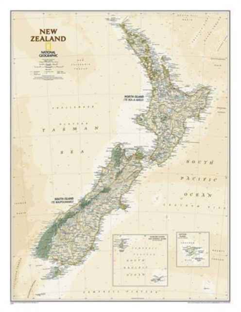 The reference map of New Zealand uses Expertly researched and designed, National Geographic's Executive style with an antique-style color palette and stunning shaded relief. The map shows this island nation in great detail, from the subtropical North Island (Te Ika-a-Maui) to the glacial carved valleys of Fiordland on the South Island (Te Waipounamu). The North Island is best known for large volcanic lakes and the cities of Auckland and Wellington. The South Island is famous for the Southern Alps that run along the spine of the island. The highest point in the country is Aoraki (Mount Cook) and is found in the Southern Alps.
