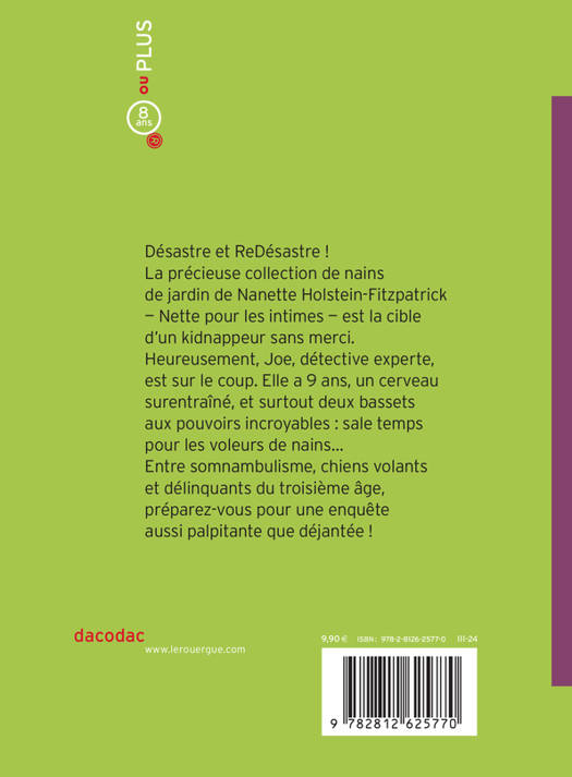 Nifle et ReNifle, les chiens enquêteurs adeptes de la sieste, sont de retour ! Avec Joe, leur jeune maîtresse détective privée spécialiste des personnes âgées, ils vont mener une nouvelle enquête particulièrement dangereuse : un vol de nain de jardin dans une maison de retraite. Oui, vous avez bien lu, vous allez devoir être sacrément courageux et vous accrocher bien fort à votre maman, parce que ça va secouer !