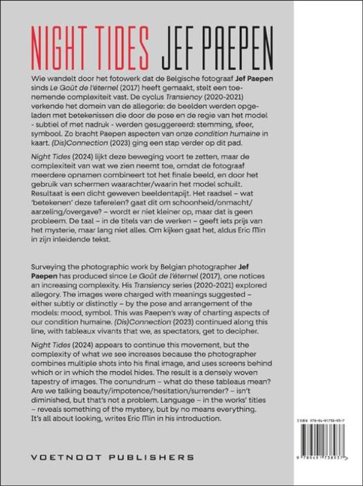 Wie wandelt door het fotowerk dat de Belgische fotograaf Jef Paepen sinds 'Le Goût de l’éternel' (2017) heeft gemaakt, stelt een toenemende complexiteit vast. De cyclus 'Transiency' (2020-2021) verkende het domein van de allegorie: de beelden werden opgeladen met betekenissen die door de pose en de regie van het model - subtiel of met nadruk - werden gesuggereerd: stemming, sfeer, symbool. Zo bracht Paepen aspecten van onze condition humaine in kaart. '(Dis)Connection' (2023) ging een stap verder op dit pad.