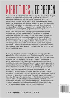 'Night Tides' (2024) lijkt deze beweging voort te zetten, maar de complexiteit van wat we zien neemt toe, omdat de fotograaf meerdere opnamen combineert tot het finale beeld, en door het gebruik van schermen waarachter/waarin het model schuilt. Resultaat is een dicht geweven beeldentapijt. Het raadsel – wat ‘betekenen’ deze taferelen? gaat dit om schoonheid/onmacht/aarzeling/overgave? – wordt er niet kleiner op, maar dat is geen probleem. De taal – in de titels van de werken – geeft iets prijs van het mysterie, maar lang niet alles. Om kijken gaat het, aldus Eric Min in zijn inleidende tekst.