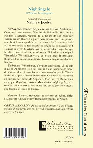 Nightingale nous raconte l'histoire de Philomèle, fille du Roi Pandion d'Athènes, victime de la luxure de son beau-frère Téréus, roi de Thrace. La pièce nous montre, avec une passion rare, la violence engendrée par tout silence forcé : après avoir été violée, Philomèle se fait arracher la langue par son agresseur. Il s'ensuit un cycle de rétribution qui ne prendra fin que lorsque les dieux interviendront, transformant Philomèle en rossignol.