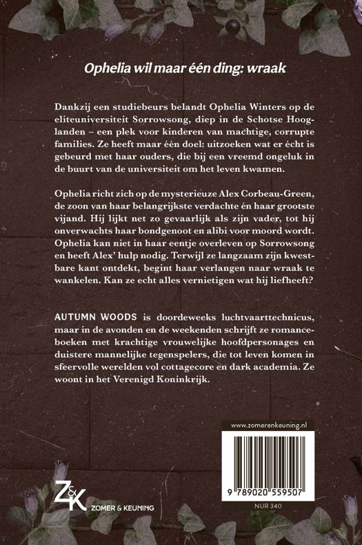 Ophelia krijgt onverwacht toegang tot Sorrowsong University, een elitaire school diep in de Schotse Hooglanden, om de mysterieuze dood van haar ouders te onderzoeken. Haar missie: onopgemerkt blijven, de waarheid achterhalen en wraak nemen. Maar wanneer ze botst met Alex Corbeau-Green, de zoon van haar hoofdverdachte, verandert alles. Terwijl een onbekende haar begint te stalken en Alex haar onverwachte bondgenoot én haar alibi voor moord wordt, begint haar zorgvuldig geplande wraak te wankelen… net als haar hart.