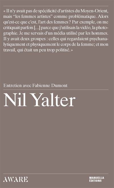 Cet entretien avec Nil Yalter est le premier volume d’une collection d’entretiens inédits créée en lien avec le prix d’honneur AWARE pour les artistes femmes, remis chaque année depuis 2017 à une plasticienne, liée à la France, pour l’ensemble de sa carrière. Cette collection poursuit les objectifs du prix : donner une visibilité à des artistes femmes dont les carrières ont pâti des biais de genre. Au-delà de cette question, il s’agit de donner accès à la parole des artistes. Cet ouvrage est l’occasion pour Nil Yalter de revenir sur l’ensemble de sa carrière : depuis la mise en place d’un art « sociocritique » dans les années 1970, pionnier dans l’art vidéo, proche du documentaire et en dialogue avec ses engagements féministe et communiste, exposant la condition des femmes, de la classe ouvrière ou des migrant·e·s, jusqu’à son usage des nouveaux médias dans une exploration de l’abstraction. Cet entretien est réalisé par Fabienne Dumont, historienne de l’art, critique d’art et enseignante en école d’art, spécialiste de la scène artistique féministe des années 1970.