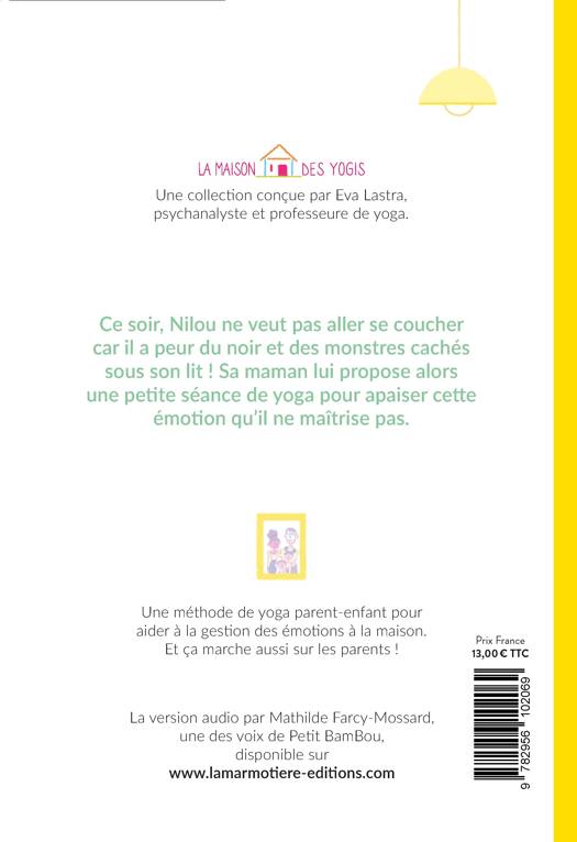 Ce soir, Nilou ne veut pas aller se coucher car il a peur du noir et des monstres cachés sous son lit ! Sa maman lui propose alors une petite séance de yoga pour apaiser cette émotion qu'il ne maîtrise pas.<br /><br /> La Maison des yogis, une collection conçue par Eva Lastra, psychanalyste et professeure de yoga.<br /><br /> Une méthode de yoga parent-enfant pour aider à la gestion des émotions à la maison. Et ça marche aussi sur les parents !