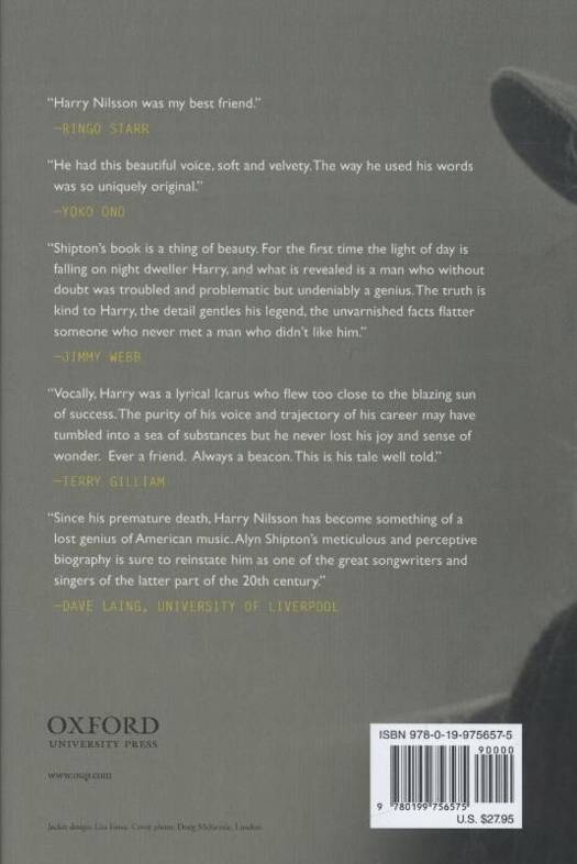 In this first ever full-length biography, Alyn Shipton traces Nilsson's life from his Brooklyn childhood to his Los Angeles adolescence and his gradual emergence as a uniquely talented singer-songwriter. With interviews from friends, family, and associates, and material drawn from an unfinished autobiography, Shipton probes beneath the enigma to discover the real Harry Nilsson. A major celebrity at a time when huge concerts and festivals were becoming the norm, Nilsson shunned live performance. His venue was the studio, his stage the dubbing booth, his greatest triumphs masterful examples of studio craft. He was a gifted composer of songs for a wide variety of performers, including the Ronettes, the Yardbirds, and the Monkees, yet Nilsson's own biggest hits were almost all written by other songwriters. He won two Grammy awards, in 1969 for "Everybody's Talkin'" (the theme song for Midnight Cowboy), and in 1972 for "Without You," had two top ten singles, numerous album successes, and wrote a number of songs--"Coconut" and "Jump into the Fire," to name just two--that still sound remarkably fresh and original today. He was once described by his producer Richard Perry as "the finest white male singer on the planet," but near the end of his life, Nilsson's career was marked by voice-damaging substance abuse and the infamous deaths of both Keith Moon and Mama Cass in his London flat.