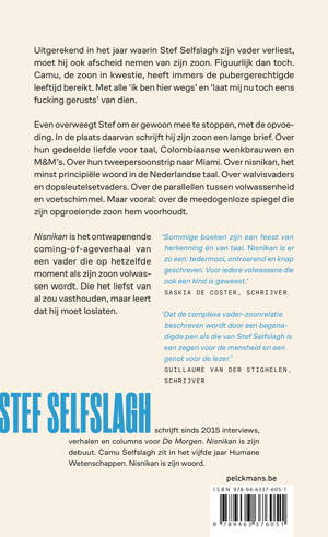 Stef Selfslagh schrijft sinds 2015 interviews, verhalen en columns voor De Morgen. Nisnikan is zijn debuut. Camu Selfslagh zit in het vijfde jaar Humane Wetenschappen. Nisnikan is zijn woord.