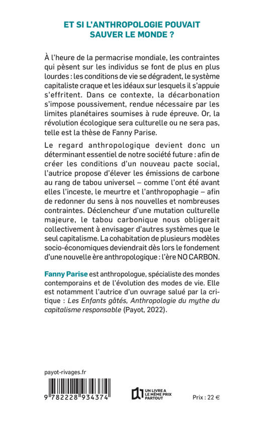 À l'heure de la permacrise mondiale, les contraintes qui pèsent sur les individus se font de plus en plus lourdes : les conditions de vie se dégradent, le système capitaliste craque et les idéaux sur lesquels il s'appuie s'effritent. Dans ce contexte, la décarbonation s'impose poussivement, rendue nécessaire par les limites planétaires soumises à rude épreuve. Or, la révolution écologique sera culturelle ou ne sera pas, telle est la thèse de Fanny Parise. Le regard anthropologique devient donc un déterminant essentiel de notre société future : afin de créer les conditions d'un nouveau pacte social, l'autrice propose d'élever les émissions de carbone au rang de tabou universel - comme l'ont été avant elles l'inceste, le meurtre et l'anthropophagie - afin de redonner du sens à nos nouvelles et nombreuses contraintes. Déclencheur d'une mutation culturelle majeure, le tabou carbonique nous obligerait collectivement à envisager d'autres systèmes que le seul capitalisme. La cohabitation de plusieurs modèles socio-économiques deviendrait dès lors le fondement d'une nouvelle ère anthropologique : l'ère NO CARBON.