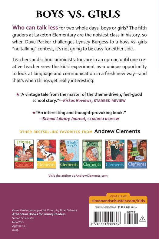It's boys vs. girls when the noisiest, most talkative, and most competitive fifth graders in history challenge one another to see who can go longer without talking. Teachers and school administrators are in an uproar, until an innovative teacher sees how the kids' experiment can provide a terrific and unique lesson in communication. In No Talking, Andrew Clements portrays a battle of wills between some spunky kids and a creative teacher with the perfect pitch for elementary school life that made Frindle an instant classic.
