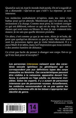 Quand je suis né, tout le monde était perdu. On m'a regardé et on a demandé : « Qu’est-ce que c'est ? » La réponse : je suis intersexe. Les médecins souhaitaient m'opérer, mais ma mère s'est battue pour qu'on attende. Maintenant que j'ai seize ans, ils reviennent à la charge. Comme mon père, ils veulent corriger ce qui est différent, enlever ce qui est de trop. Ils aiment les choses qui sont roses ou bleues. Et moi, je suis vraiment très mauve. Je ne sais pas quelle décision prendre. Un alien, c'est comme ça que je me sens. Alors je m'isole, de peur que quelqu'un découvre ce que je suis. Mes seuls amis sont les personnes âgées que je visite bénévolement. Il y a aussi Maël. Il m'attire, mais j'ai l'impression que nous sommes à des années-lumière de distance. Ce n'est pas facile de penser à changer son corps. Est-ce ça qu'il me faut pour m'accepter ? Les personnes intersexes naissent avec des caractères sexuels (génitaux ou génétiques) qui ne correspondent pas aux définitions types des corps masculins ou féminins. Ces caractéristiques peuvent être visibles à la naissance, apparaître durant l'enfance, la puberté ou l'âge adulte, ou demeurer invisibles. Selon les experts, il y a autant de personnes intersexes que de personnes rousses. Actuellement, les médecins recommandent de ne pas opérer les enfants intersexes afin de les laisser s'approprier leur identité de genre.