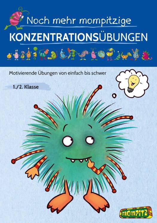 In kleinen Häppchen begleiten die Kinder die Mompitze durch ihren Alltag und trainieren dabei die eigene Konzentrationsfähigkeit. Von leichten Übungen zum Ausmalen über etwas schwierigere Logikaufgaben bis hin zu Schüttelwörtern und kleinen Zählübungen hält dieser Titel eine bunte Mischung an Arbeitsaufträgen für die 1. bis 2. Klasse bereit.