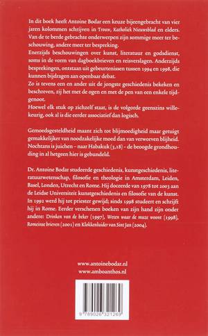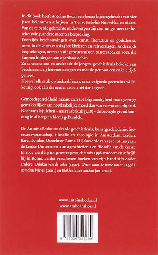 In dit boek heeft Antoine Bodar een keuze bijeengebracht van vier jaren kolommen schrijven in 'Trouw', 'Katholiek Nieuwsblad' en elders. Van de te berde gebrachte onderwerpen zijn sommige meer ter beschouwing, andere meer ter bespreking.