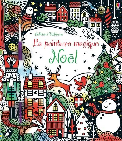 Une ribambelle de cadeaux, une maison en pain d'épice, un magnifique sapin de Noël et ses décorations, ou encore le përe Noël et ses rennes : avec le pinceau fourni, passe un peu d'eau sur les illustrations en noir et blanc pour faire apparaître les couleurs comme par magie. On peut ensuite détacher les pages et exposer ses oeuvres d'art un peu partout !