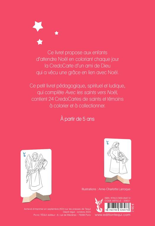 Un pendant chrétien aux cartes Pokémon : 24 cartes de saints et témoins à collectionner avec leur support. D’autres CredoCartes sont disponibles dans La Toussaint à colorier, dans Avec les saints vers Noël, Avec les saints vers Pâques, Avec les saints vers l’Ascension et la Pentecôte, Avec les saints vers l’Assomption et Avec les saints vers la Toussaint + dans le numéro 511 de Patapon. Un livret pédagogique, spirituel et ludique pour préparer son cœur à la joie de Noël. Sainte Anne, saint François-Xavier, Carlo Acutis, saint Nicolas, saint Ambroise de Milan, saint Philippe Néri, saint Vincent de Paul, saint Jean-Marie Vianney, sainte véronique, sainte Lucie, sainte Odile, saint Wenceslas, saint Dominique Savio, sainte Kateri Tekakwitha, saint Zacharie, l’ange Gabriel, sainte Elisabeth, saint Jean-Baptiste, saint François d’Assise + crèche : Marie, Joseph, Enfant Jésus, bœuf et âne.