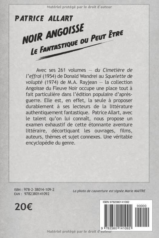 Avec ses 261 volumes — du Cimetière de l’effroi (1954) de Donald Wandrei au Squelette de volupté (1974) de M.A. Rayjean — la collection Angoisse du Fleuve Noir occupe une place tout à fait particulière dans l’édition populaire d’après-guerre. Elle est, en effet, la seule à proposer durablement à ses lecteurs de la littérature authentiquement fantastique. Patrice Allart, avec le talent qu’on lui connaît, nous propose un examen exhaustif de cette étonnante aventure littéraire, décortiquant les ouvrages, films, auteurs, thèmes et sujet connexes. Une véritable encyclopédie du genre.
